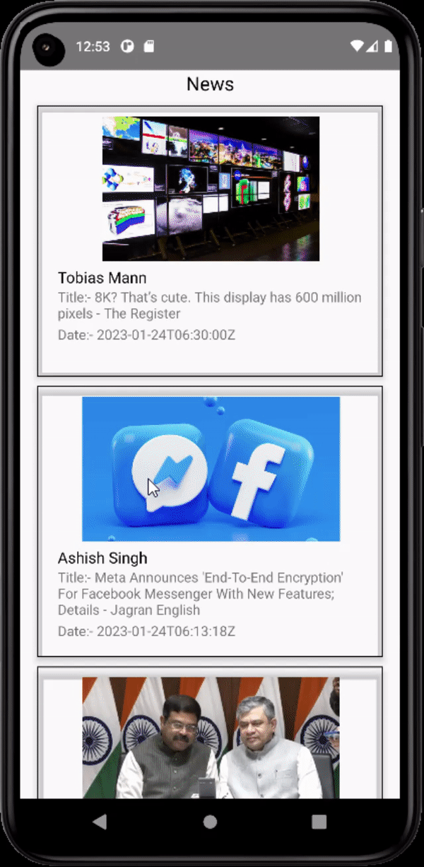 npm installand thennpx react-native run-android. It will start the emulator on your system. - Wait until the bundling process is done.Consider image 1 as the output for the news app on the emulator.
