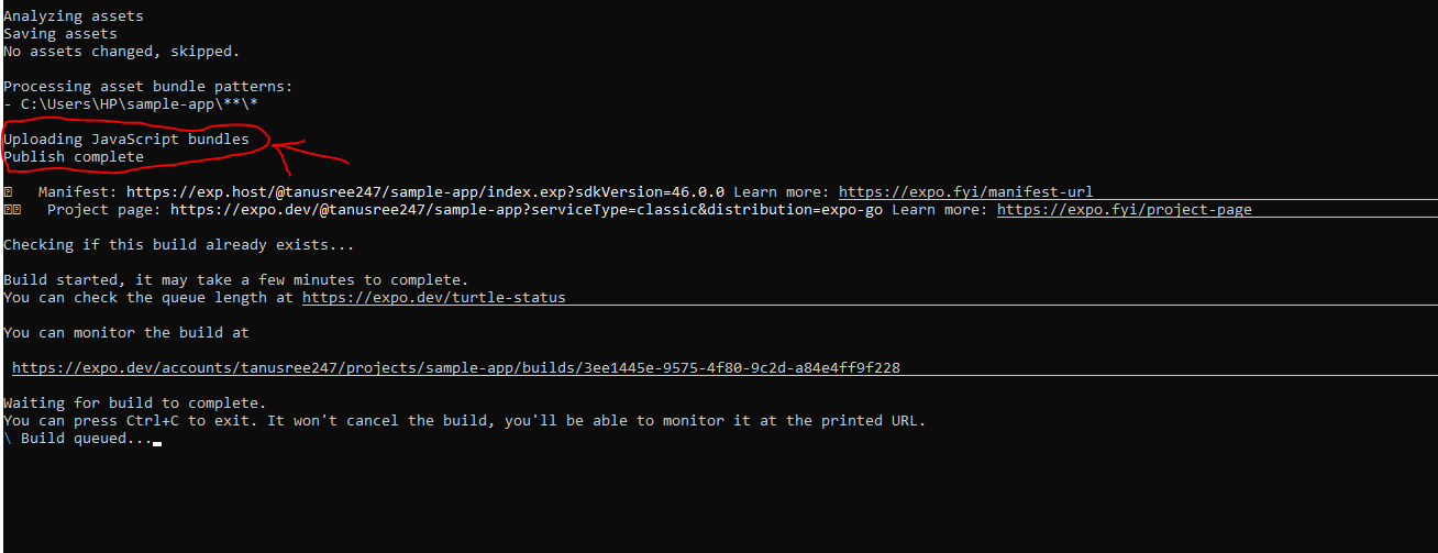 - Wait till the Javascript bundle is built. In the running cmd, you can see that publish is completed and the Javascript bundle has been uploaded to your Expo account. Refer to image 4.