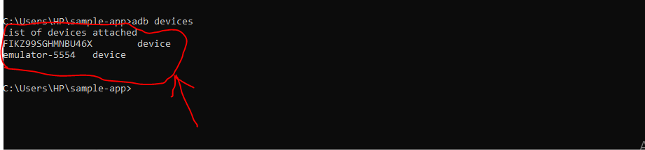 - To make sure that the phone device is connected to the PC, open the cmd from your project folder and pass