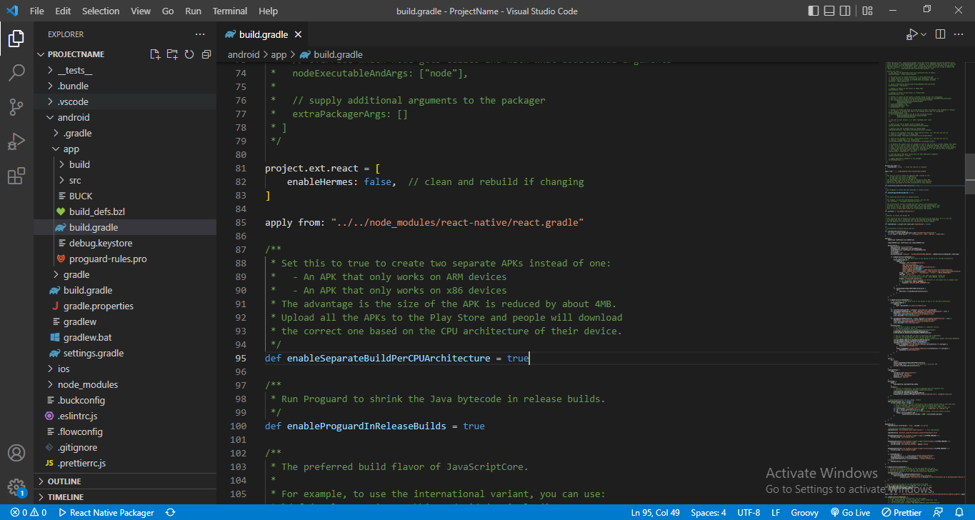 def enableProguardInReleaseBuilds= falseinto true. This would direct the Progaurd to shrink the Java Bytecode. - Repeat the same thing for def