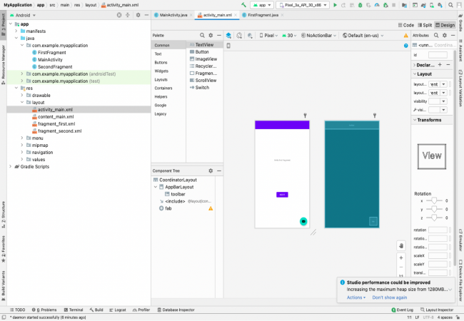 After the background processing, it’ll take you to the main window of your Android project. There will be two tabs available on the right-hand side –