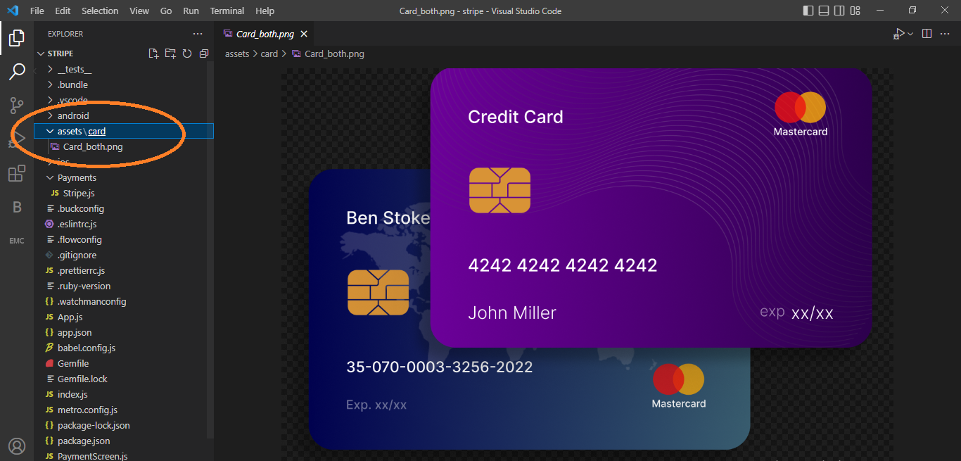 - For the image of credit cards, you have to store some images in the assets folder. Refer to image 1 for the assets folder of the current project. You simply need to download a relevant image and create a folder named assets\card. Then save the image under this folder with any name like Card_both.png. Note that it has to be in png format. This image will be shown on the user’s screen when they will open their Stripe account.